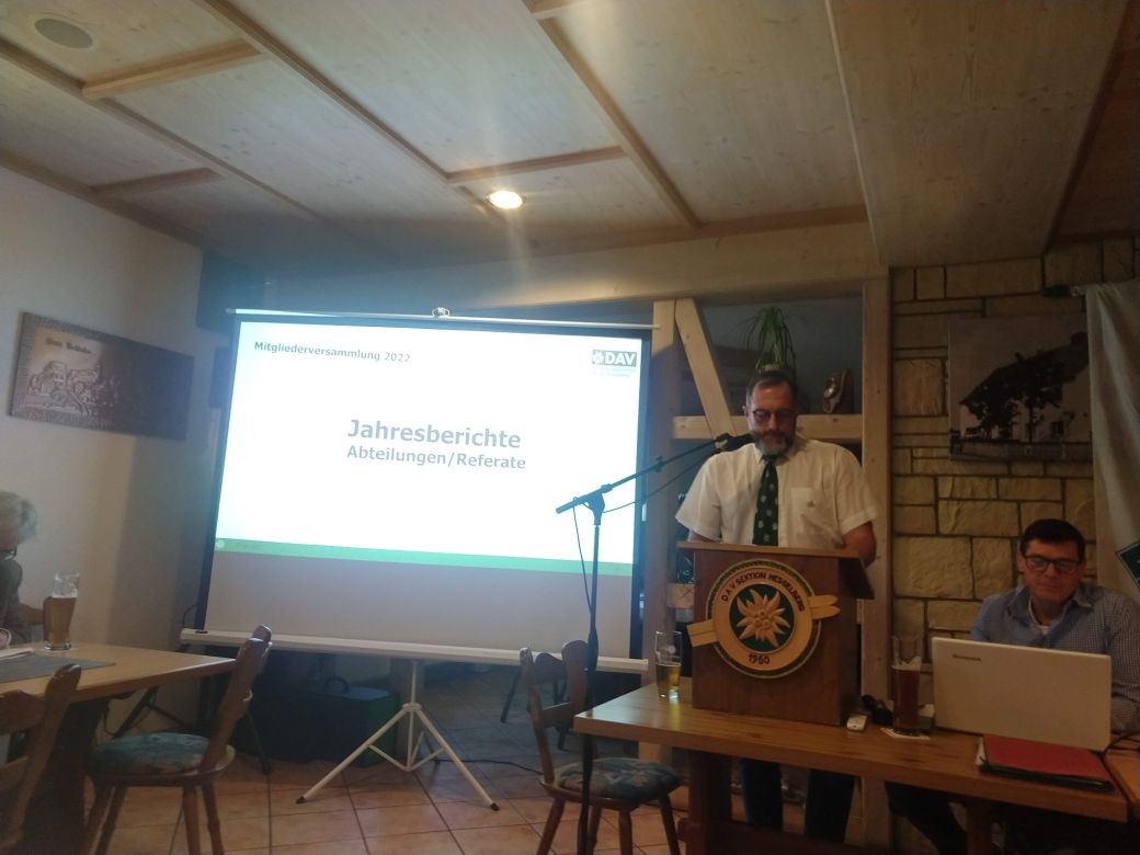 Als nächstes trat der Jugendreferent Andreas Gundacker ans Mikrofon. Er führte die Sektionsmitglieder durch die Berichte aller Abteilungen. Von Wintersport und Skigymnastik über Wandern und Laufsport bis hin zu Mountainbiken und Klettern konnte die Sektion ihr Programm wie vor Corona anbieten. Die Jugendarbeit konnte wieder aufgenommen werden und auf den beiden Hütten sowie im Kletterturm werkelten viele fleißige Hände. Die Schutzhütte am Hesselberg schaffte es gar ins Fernsehen: Sie wird heuer im Juni im Franken-Tatort zu sehen sein. Ausführliche Berichte und Bilder aller Veranstaltungen sowie Ausschreibungen für kommende Events finden sich hier auf der Homepage.