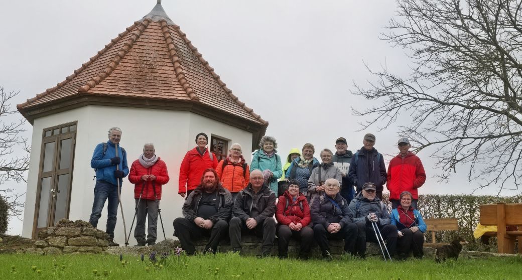 Bei wechselhaftem Wetter starteten 18 Personenam Sportplatz von Geilsheim, dann ging es in Richtung Süden zum Turtelberg. Herrliche Aussicht von dort nach Osten zum Hahnenkamm.