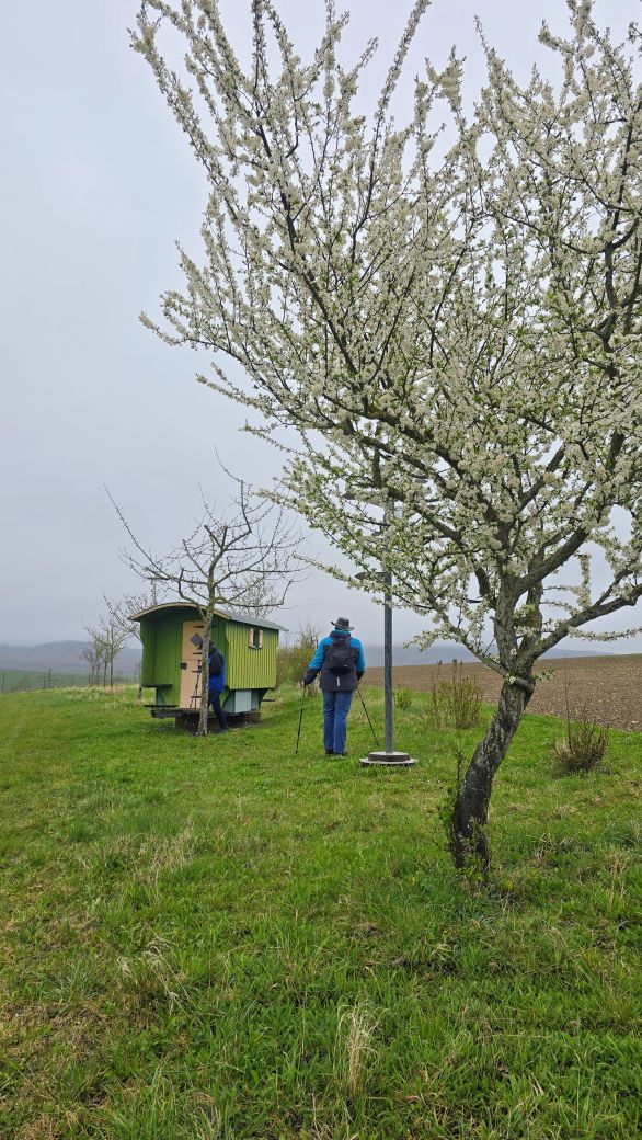 Weiter zum Wachtlerberg. Ein schöner Wald mit unterschiedlichem Bewuchs und Wanderwegen, stellenweise aber nur im Gänsemarsch zu begehen, Blick durch die Bäume nach Norden nach Stetten und Weilerau. Nach dem Abstieg Besuch der privaten Feldgeschworenen-Kapelle von Georg Neidlein aus Geilsheim.