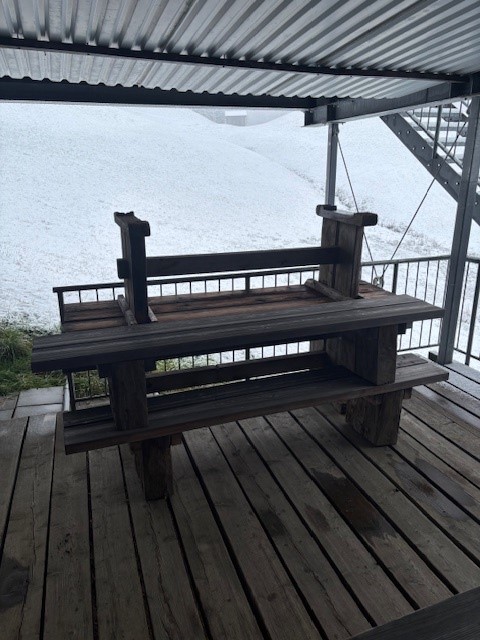 - Bänke und Tische vor der Hütte für den Winter am unteren Parkdeck verstaut